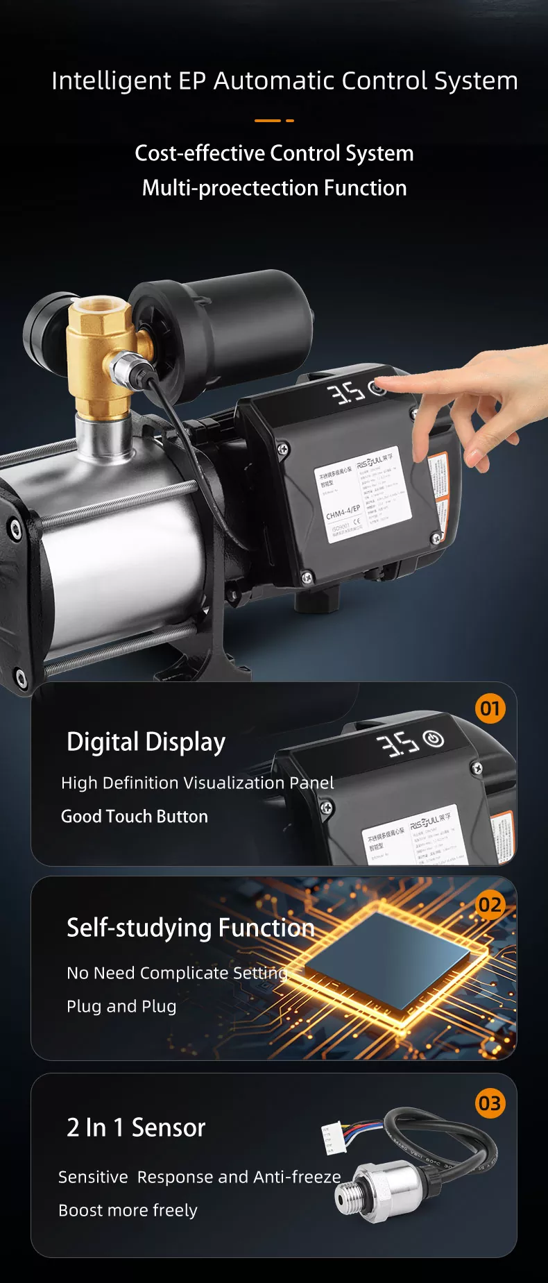 | CHM4-3/EP | 0.55 | 6.8 | 29.5 | 4m³ / h @ 23m | 3 | 304x174x255 | 12.5 |